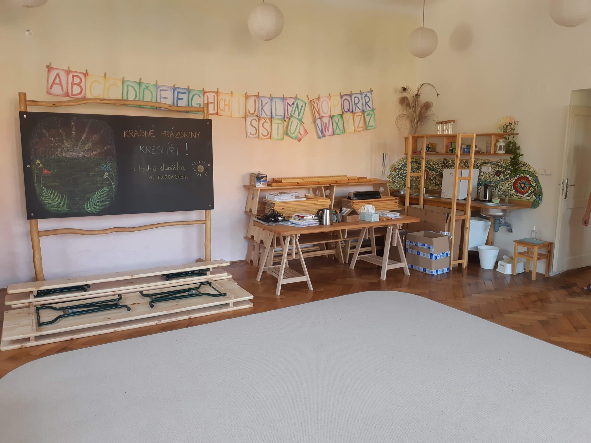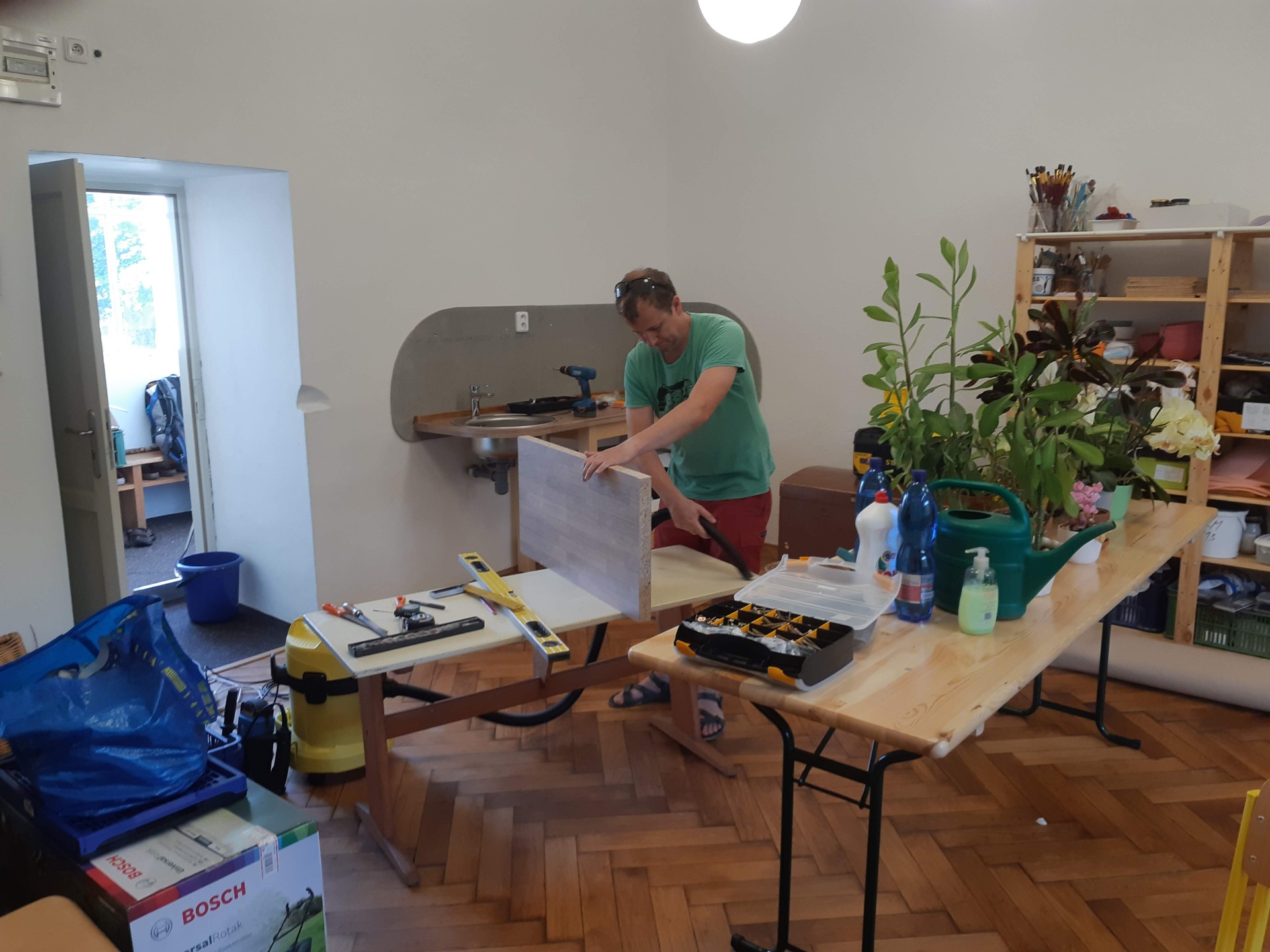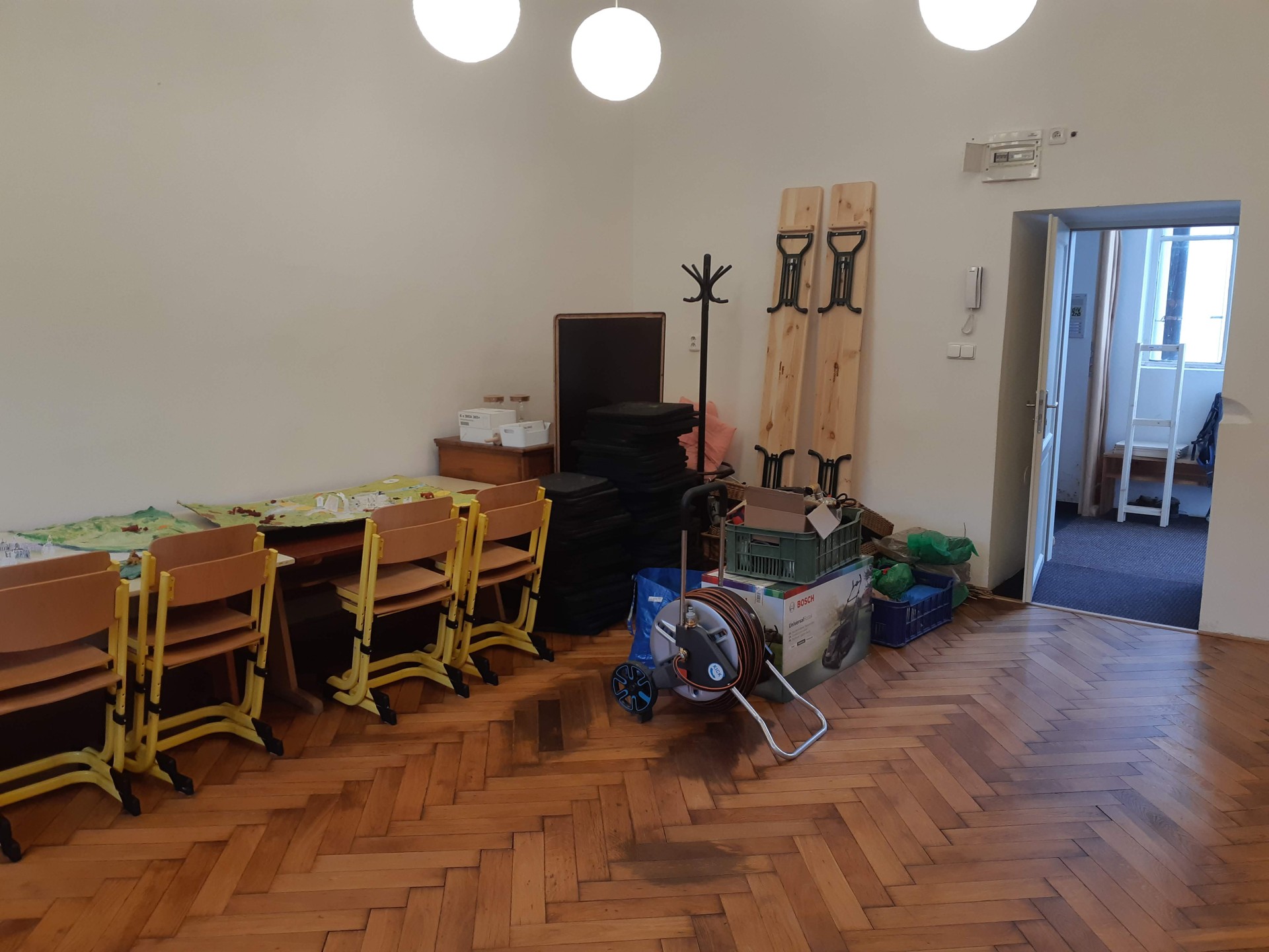 Od září nám přibude další kmenové třída, s novými zaměstnanci i potřeba dalších „obslužných“ prostor. Přibyla i řada pomůcek pro výuku, které je třeba někde přehledně uložit. Nové prostory je třeba vymalovat, stejně jako některé z těch stávajících. No, zkrátka budujeme…