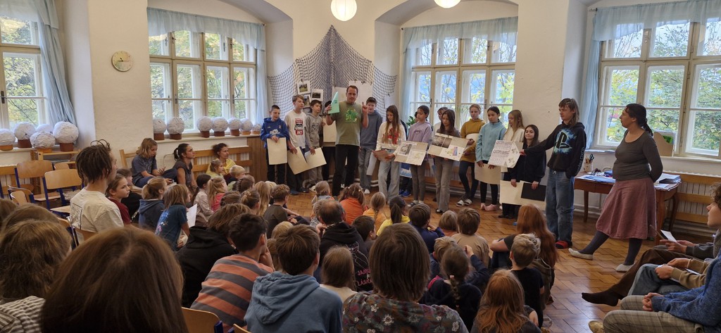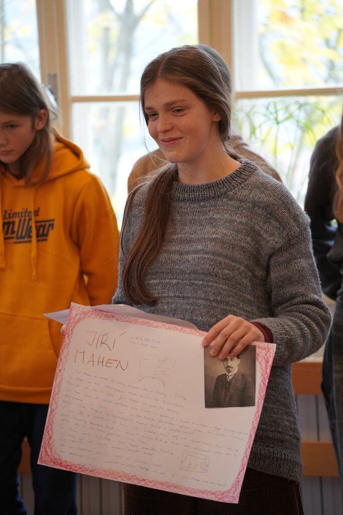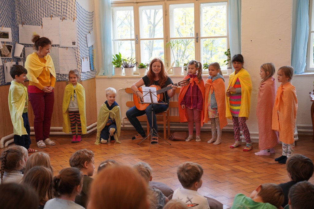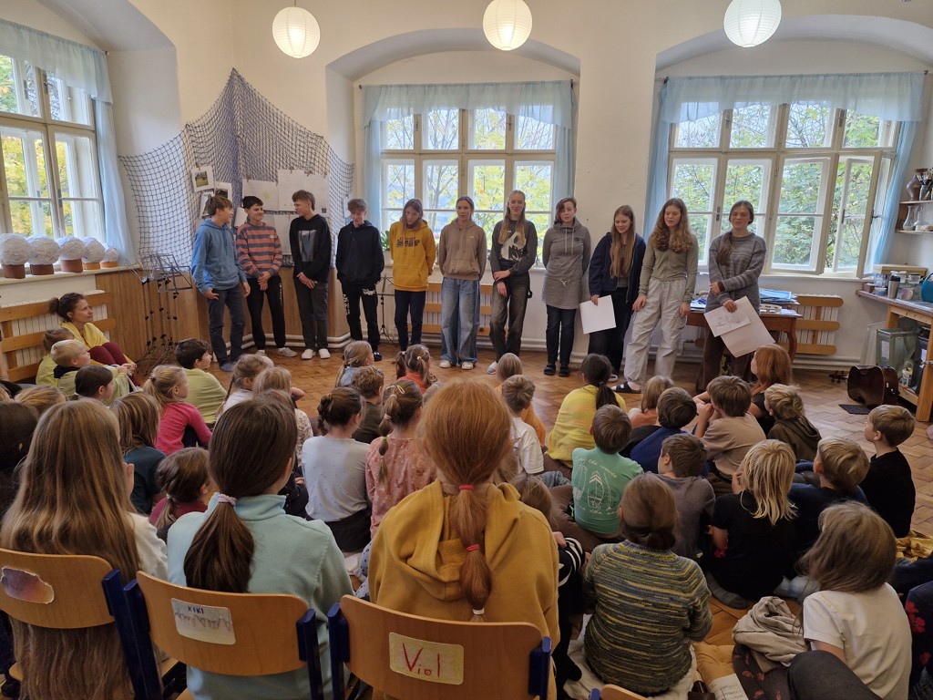 Na té říjnové nejmladší Malíři zazpívali českou i německou písničku, Písaři sehráli kratičké představení Poutníci a platan, Tovaryši zazpívali zhudebněnou baladu o Václavu Babinském. Druhostupňoví Peregríni zase představili svůj projekt Klimazahrada a nejstarší Sinvien se pochlubili dvěma referáty o významných brněnských osobnostech a zarecitovali básně Františka Halase a Antonína Sovy. Celou slavnost s grácií moderovaly naše deváťačky